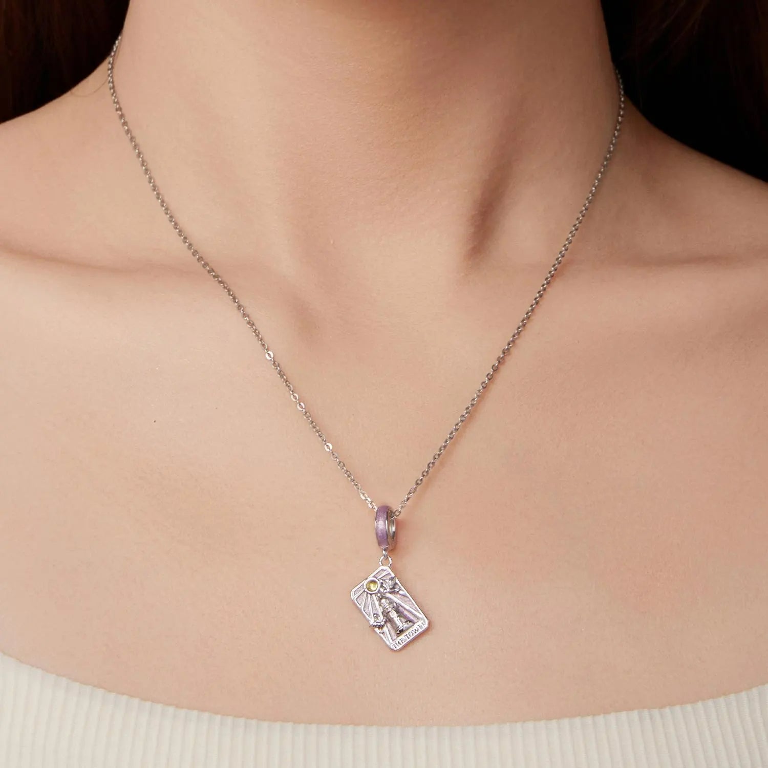 The card silhouette is bold and vertical, with a central motif that may suggest a tower, lightning, falling crowns or scattered fragments—symbols of disruption, revelation and liberation. Even at a delicate size, the composition is arranged to feel intentional and dynamic, giving the pendant a sense of impact without chaos. Worn alone, it feels like a private acknowledgment of what you’ve survived; layered with other cards, it becomes the shock point of your “spread”, the place where everything gets rearranged.