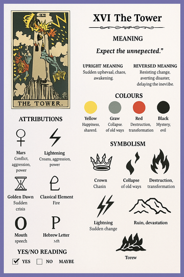 In tarot, THE TOWER is the card of sudden change, shattered illusions and necessary collapse. It speaks of structures—relationships, careers, identities, beliefs—that were never as solid as you thought. When the Tower appears, it doesn’t create the weakness; it reveals it, so that you don’t have to keep building on a cracked foundation.